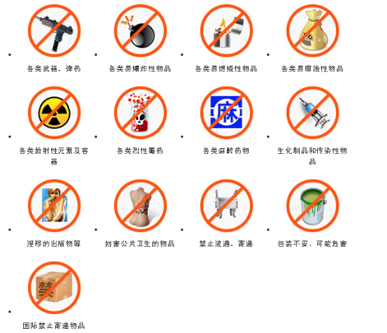 國(guó)家法律、法規(guī)、行政規(guī)章明令禁止流通、寄遞或進(jìn)出境的物品,有國(guó)家秘密文件和資料、國(guó)家貨幣 偽造的貨幣和有價(jià)證券、仿真武器、管制刀具、珍貴文物(包含文房四寶等物品)、瀕危野生動(dòng)物及其制品等。